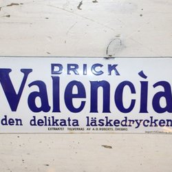 DRICK VALENCIA DEN DELIKATA LÄSKEDRYCKEN. EMAJERAD KUPAD SKYLT .1910-1920