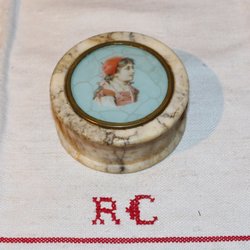 ANTIK ASK MED INGLASAT MOTIV. MARMOR.