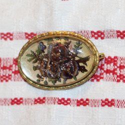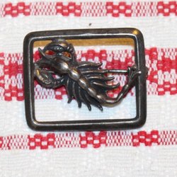 ANTIK BROSCH MED VACKERT MOTIV. GULMETALL.