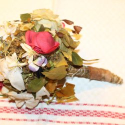 ANTIK BUKETT MED TYGBLOMMOR.