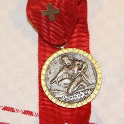 ÄLDRE SKYTTEMEDALJ MONTERAD PÅ KRÖNT SKÖLD AV TRÄ.
