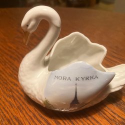Svan i porslin med motiv av Mora kyrka
