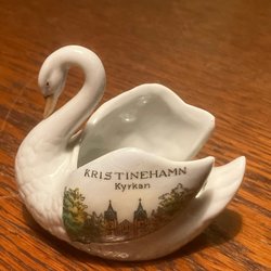 Svan i porslin med motiv av kyrkan i Kristinehamn