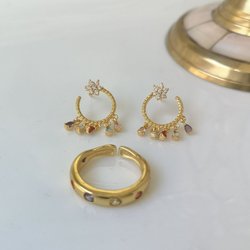 Guldpläterat Smyckesset med Färgade Stenar - Ring och Örhängen