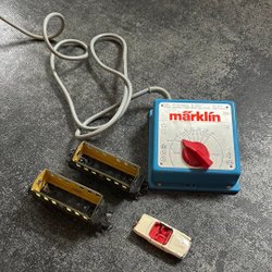 Märklin transformator, två vagnar och Matchbox bil
