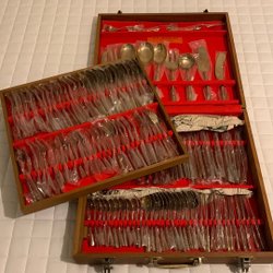 Helt sett med bestick, väska/portfölj i trä med finbestick