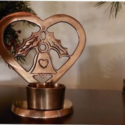 Ljusstake i mässing,med julklocka och järneksblad inristade.