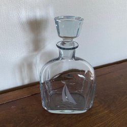 Munblåst isblå karaff med etsad segelbåt