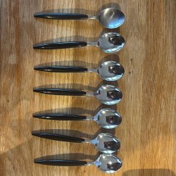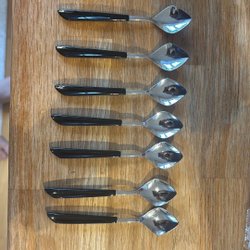 Sju skedar med svart handtag. Äldre