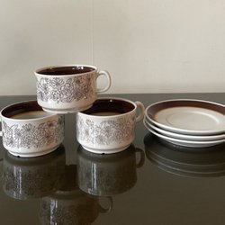 Retro TEKOPPAR med fat, 6 delar, porslin, Gefle + KAFFEKOPPAR med fat