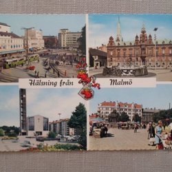 Malmö Hälsning från Trevligt Flerbildskort med bl a Spårvagn och torghandel