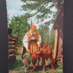 Dalarna På fäbovallen Kvinna matar kalv Pressbyrån