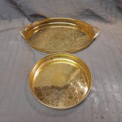 Två guldfärgade brickor