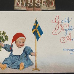 Litet vykort Osignerat Jenny Nyström Pojke med svenska flaggan