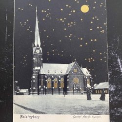 Hälsingborg kyrka Med guldtryck på stjärnor och fönster effektfullt