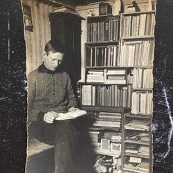 Äkta fotografivykort Ung man läser bok i bibliotek