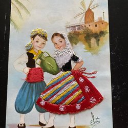 Klassiskt spanien vykort med sydd klänning från 1960-70 talet