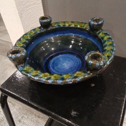 Glaserad Keramikskål med fyra ljushållare runt kanten, sign. Anette Danielsson