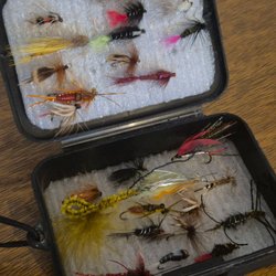 Flugor för fiske i låda