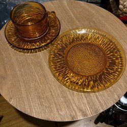 6 st Vereco koppar med fat + 6 assietter i bärnsten, 1970-tal vintage retro