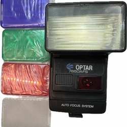 Vintage kamera blixt OPTAR 7650AFS external Photo Flash med 4 color filters