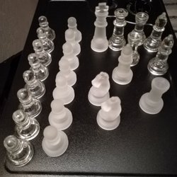 Äldre glaspjäser o varierande skick. Schackspel.