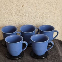 Höganäs 5 blåa muggar med träunderlägg