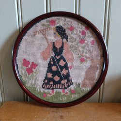 Gammal broderad tavla kvinna med räfsa bredvid äppelträd