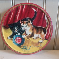 Gammalt plåtlock ( tavla bricka underläggen)med kattmotiv Kärnkaffe