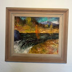 Målad tavla med fors och fjällmotiv