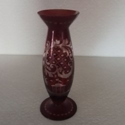 Röd vas vintage med silver färgade målningar inriktade i glaset.