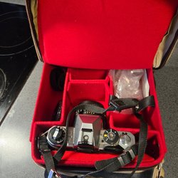 Kamera med objektiv och väska
