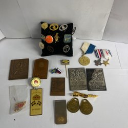 Ett parti med äldre medaljer och pins