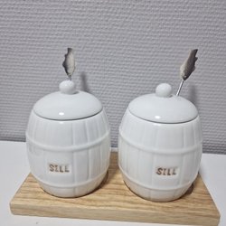 2 st "Sill" burkar med lock och skedar på träbricka