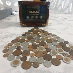 Samling av utländska valutor i trälåda