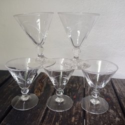 5 gamla glas på fot och med dekoration 7,8 cm höga