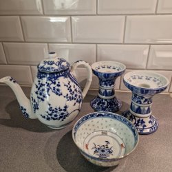 Tekanna, skål och ljusstakar i porslin