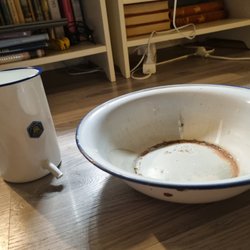 Kockums lavemangskanna och tvättfat i emalj
