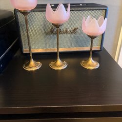 Ljusstakar i mässing med rosa glaskupor
