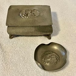 Gamla smyckeskrin (2 st) i tenn och liten skål i skönvirke-stil