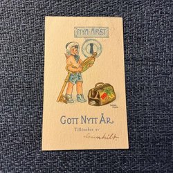 Gott Nytt År, Pojke med fyrklöversväska tittar på en klocka, Y Millde, Småkort