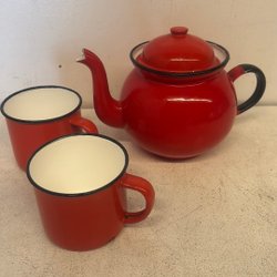 Röd emaljerad tekanna made in Poland med muggar