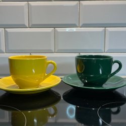 2 stora koppar med fat i gult och grönt