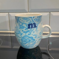 Mugg med blått mönster och bokstaven "m"