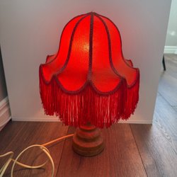 Bordslampa med röd sammetsskärm och träfot retro