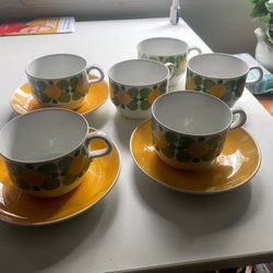 Rörstrand sex ”Happy”tekoppar och tre fat 1970-tal.