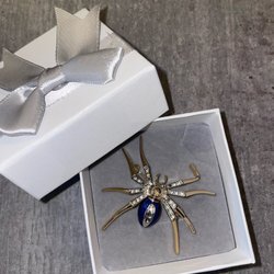 Guldig spindel brosch med blå detaljer