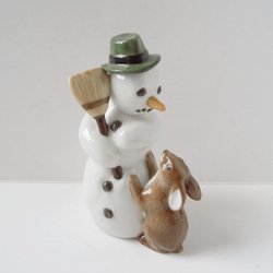 Royal Copenhagen snögubbe med kvast och stående hare