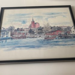 Akvarellmålning med båtar och kyrka
