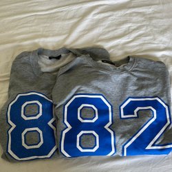 Två grå collegetröjor med tryck